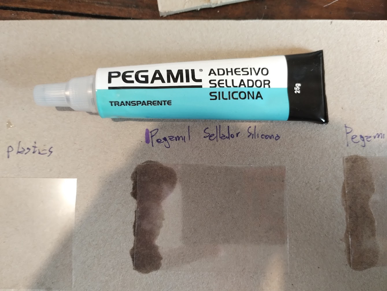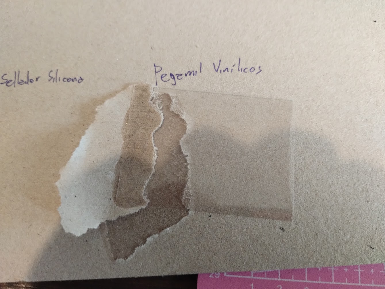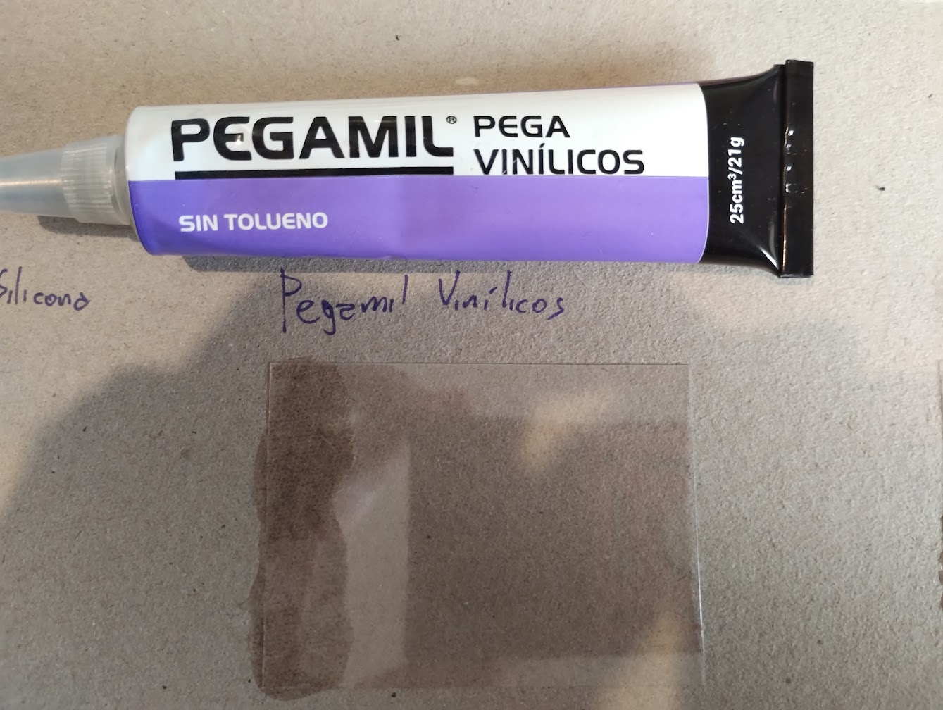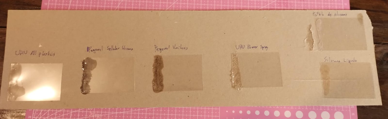 Todos los pegamentos los usé en las mismas condiciones: papel transparencia contra cartón, y siguiendo las instrucciones provistas en el envase.