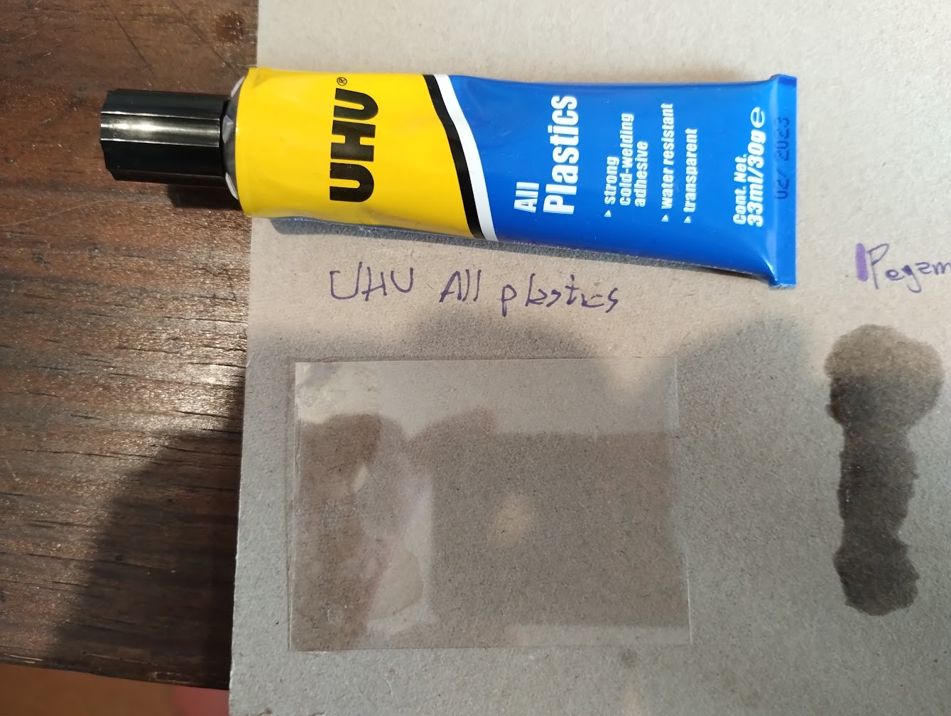 Esto es lo que había usado la otra vez, lo puse para tener un control. Mejor que el adhesivo Pegamil que nunca terminó de secar, y mejor que el UHU que sólo adhirió en un par de puntos, pero no mucho mejor.