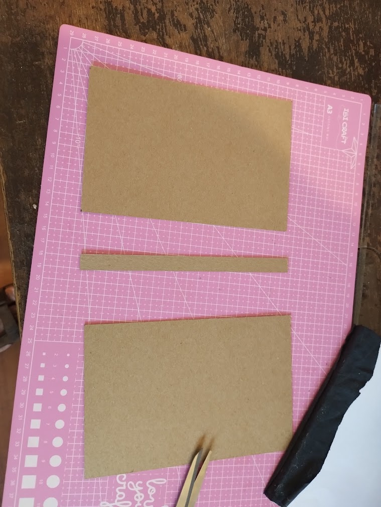 Lo siguiente es cortar las tapas. Corté dos tapas de un centímetro más de largo y medio centímetro más de ancho que el libro, y un trozo del mismo largo que las tapas, y del ancho del libro, para el lomo. Usé un pedazo de cartón gris de 1mm que tenía tirado por ahí. Comparando con otras cosas similares que hice, hubiese sido mejor cartón de 2mm, pero la ventaja de reutilizar algo que tenía tirado por ahí sin ningún otro uso es que es gratis y no tuve ni que salir a buscarlo.