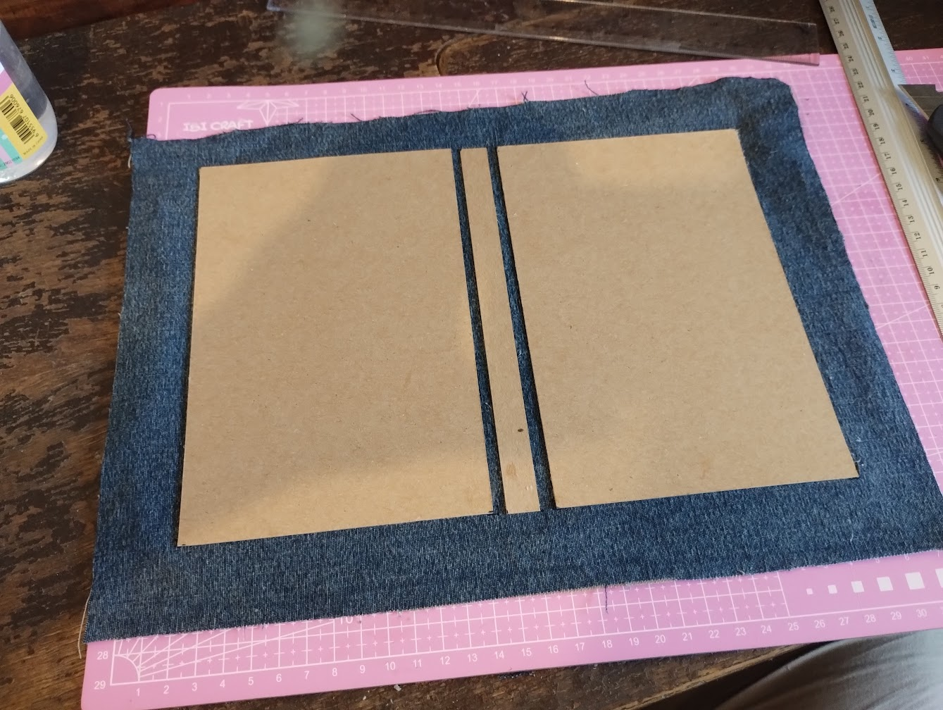 Lo siguiente fue pegar las tapas sobre el forro. Usé un pantalón de jean viejo que tenía guardado para este tipo de cosas.