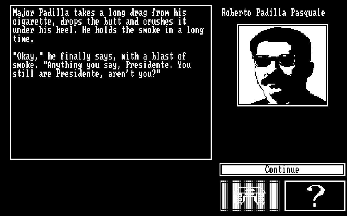 La historia, además, está muy bien lograda, sin tener esos textos y diálogos kilométricos e interminables de los juegos “con historia” de hoy en día. Cuando el Mayor Padilla te dice “Lo que usted diga, Presidente. Todavía sigue siendo Presidente, ¿verdad?” hace mucho más “worldbuilding” que veinte párrafos de historia.